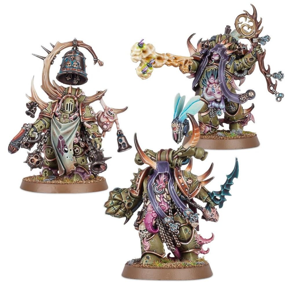 Malignant Plaguecasters are living conduits for the Garden of Nurgle's miasmas and maladies, while Noxious Blightbringers sow weakness among the enemy as their cursed bell tolls. The Plague Marine Champion drowns hordes of enemies in noxious slime with his plague spewer and cripples enemy vehicles with his blight launcher.
