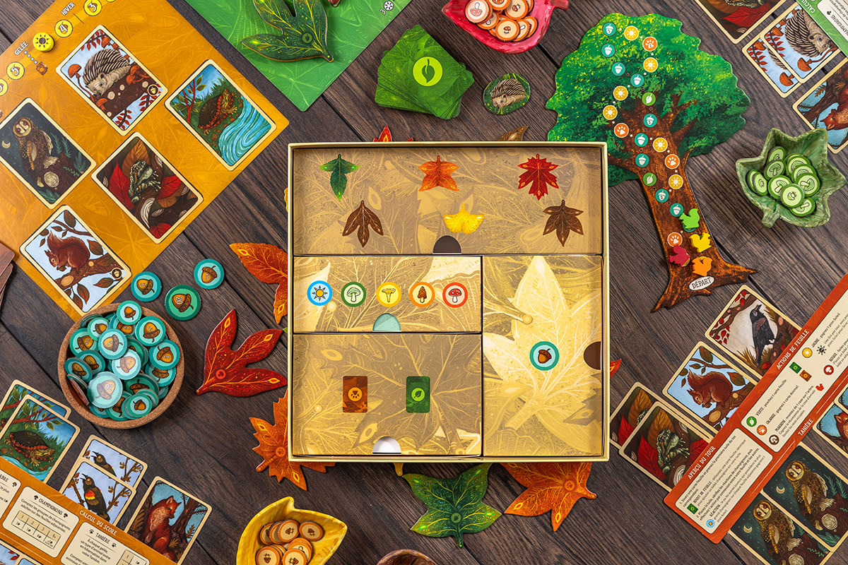 Strategically place your tiles to attract woodland animals, grow beautiful mushrooms, help your squirrel climb the tree, or earn Leaf cards and Sun tokens.