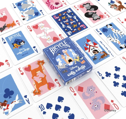 C’est les félins contre les chiens avec les cartes à jouer à vélo inspirées des chats et des chiens Disney ! Les chiens Disney remplissent les costumes noirs, tandis que les chats Disney contrôlent les rouges. Avec un adorable dos de carte d’ensemble mettant en vedette les Dalmatiens, Nana, Max, Chat du Cheshire, et plus encore ; Vous devrez peut-être apporter un sac de friandises à votre prochaine soirée de jeux !