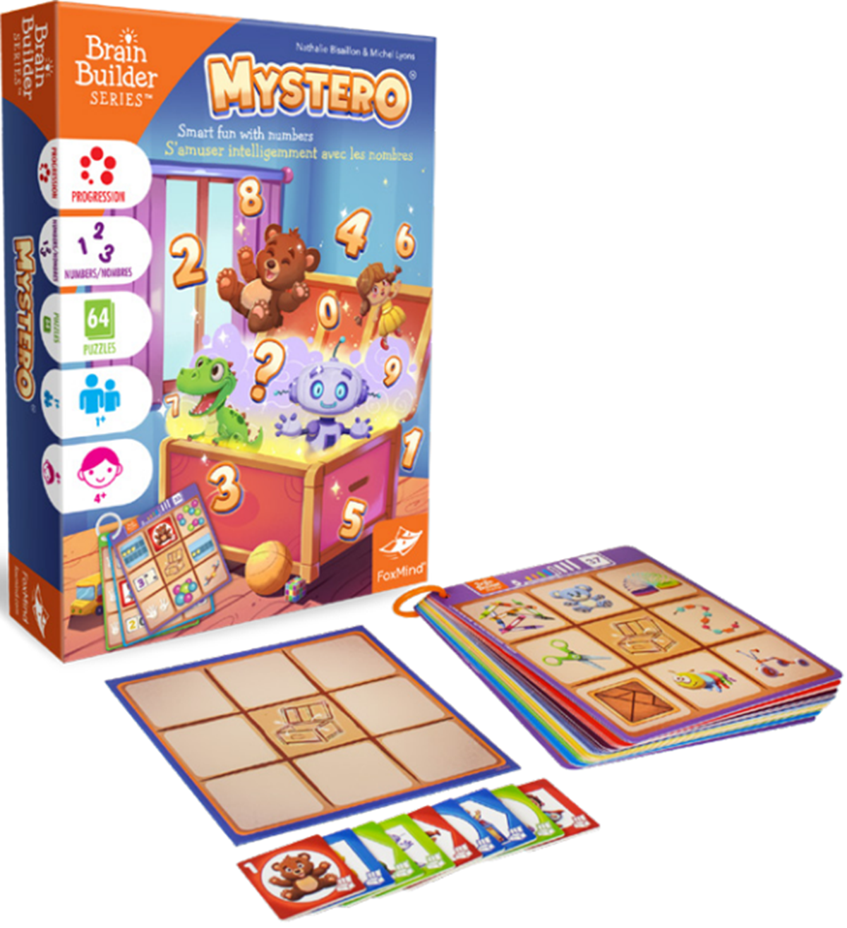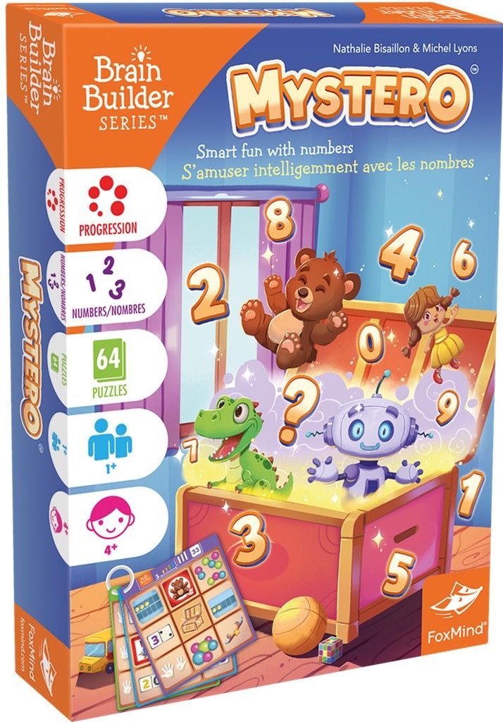 Il y a un jouet mystérieux dans le coffre à jouets... Tu peux le trouver ? Grâce à des indices visuels, les joueurs décodent huit chiffres pour révéler le neuvième. Mystero allie créativité, raisonnement et compétences verbales dans un jeu de puzzle intelligent comme aucun autre.