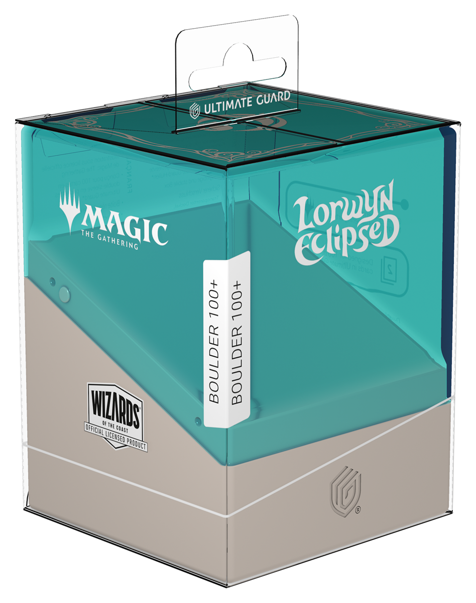 Le Boulder 100+ est une boîte de jeu durable et rigide avec une fermeture sécurisée qui peut contenir jusqu’à 100 cartes à double pochette ou 120 cartes à pochette simple dans les pochettes Ultimate Guard. Le haut entièrement transparent du Boulder et la partie inférieure solide sont imprimés avec des illustrations sous licence officielle de la prochaine extension de Magic : The Gathering, « Lorwyn Eclipsed ».