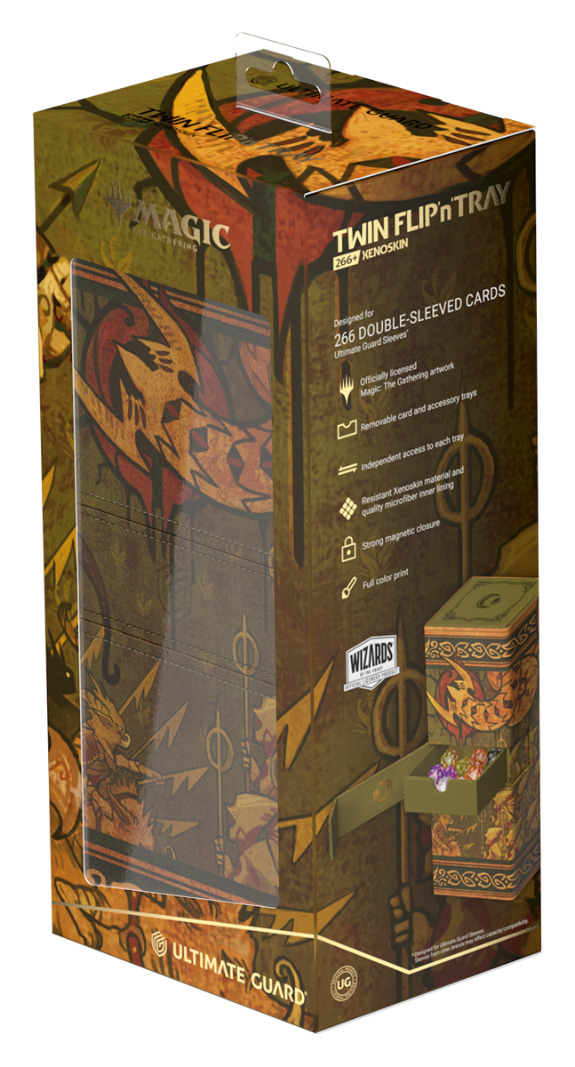 Le Twin Flip’n’Tray 266+ Xenoskin d’Ultimate Guard est une boîte de deck MTG haut de gamme dotée de deux compartiments accessibles indépendamment pour 133 cartes à double pochette (dans les pochettes Ultimate Guard*) chacun, ainsi qu’un plateau amovible supplémentaire pour les dés et les accessoires. Parfait pour le format Commander/EDH de Magic, le Twin Flip’n’Tray est imprimé avec des illustrations sous licence officielle de l’extension « Lorwyn Eclipsed » de Magic : The Gathering et offre un espace supplémentaire pour des cartes et des jetons supplémentaires. Le matériau Xenoskin durable de la boîte de jeu, la doublure intérieure en microfibre de haute qualité et les fermetures magnétiques puissantes garantissent une protection exceptionnelle des cartes. Conçu pour être combiné avec d’autres produits Ultimate Guard, le Twin Flip’n’Tray peut contenir deux boîtes de jeu Boulder 100+ lorsque les plateaux de cartes sont retirés.